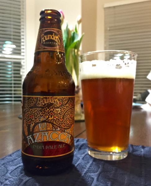 Azacca IPA pours an enticing dark amber color with a thin head. The aroma is fresh and hoppy. Has a sweet caramel malt base but still quite hoppy. The hop flavors seem to be mostly tropical (pineapple and mango) but also some citrus. Medium bodied and medium carbonation. There's a nice amount of bitterness and lingering hoppiness on the finish. Overall this is solid IPA and one that we'd like to get our hands on year round.