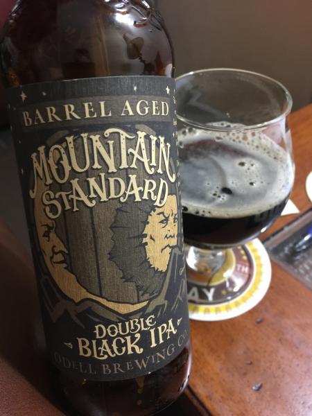 This Mountain Standard is a Barrel Aged Double Black IPA. It pours a dark brown color with one finger of creamy, tan colored head. Intense aroma that you can pick up on well before putting the glass up to your nose. Roasted malt, coffee, chocolate, and piney hops. Smells like a Barrel Aged Imperial Stout, but this is an IPA right? Taste is rich and bold. Malty like a dark beer, but still hoppy like an IPA. Hops flavors are earthy and piney. The barrel aging adds a bit of oak flavor and bourbon smoothness to the mouthfeel. Sweet, milk chocolate in the finish, coupled with a slight citrus bitterness. High quality and clearly a style that you can't get very often. This is a nice sipper and one that will keep IPA fans satisfied in the winter months.