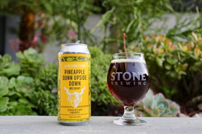 Pineapple Dunn Upside Down was created by homebrewer Jason Dunn and brewed by Stone Brewing for their One Batch Dispatch series. It pours a beautiful dark amber color with some golden highlights. Head is khaki colored, one finger thick and frothy. Phenomenal aroma of pineapple and caramel malt sweetness. This beer is a Wee Heavy or Scotch Ale at its core, but the uniqueness from the pineapple creates an amazing flavor. It’s malt-forward with a rich, velvety mouthfeel. Medium body with a bold 9.5% abv. Some caramel and cane sugar sweetness is certainly present. We thought it was really sweet at first, but after a couple sips, it’s just right. Loads of pineapple flavor make it clear why this is compared to pineapple upside down cake. Bordering on the dessert beer category but not thankfully not there in our opinion, this is a really enjoyable beer and not something you see every day.
