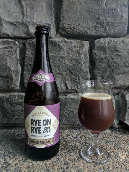 Rye on Rye on Rye pours a dark reddish Amber with a coarse, thick white head. You can pick up Bourbon right out of the bottle pouring it into your glass. We also picked up some dark cherry notes marked with molasses. The taste is similar, starting with a boozy and bourbon bite followed by lots of fig, dark dried fruits and a thick molasses sweetness to take just a little of the edge off it. The mouthfeel is pretty heavy, but it's also heavily carbonated which makes it dance on your tongue a little like a sour might. Surprisingly enough given its name, the rye is subtle, peeking out and peaking mostly in the aftertaste. It tends to warm your throat a bit, reminding you it's there long after it's gone.
