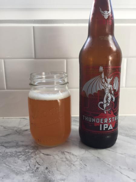 Thunderstruck IPA, a.k.a. the 19th Anniversary Ale, pours a hazy, golden color. Good head retention and lacing, and the aroma is a little dank. On the taste we find some tropical and citrus fruits, with some mango, pineapple, and grapefruit. However, the hops don't overwhelm, and with enough maltiness to create a good balance. Overall this is a solid DIPA and something you should get your hands on while you can.